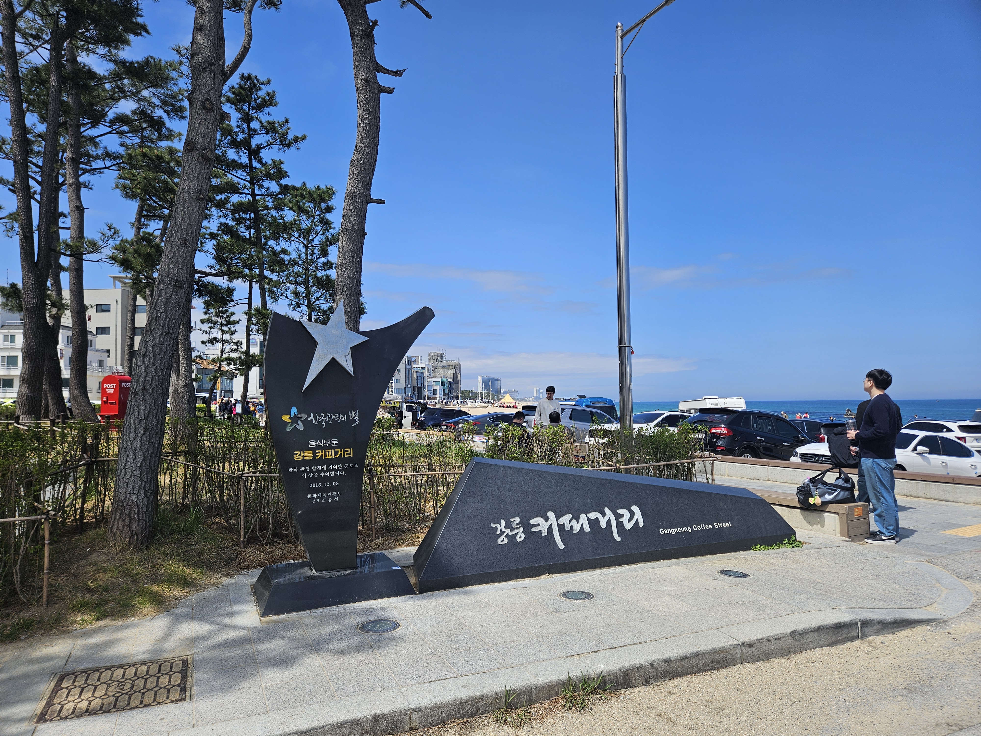 식사를 마치고 나오면서 보니, 아라담횟집 주변에는 아름다운 강릉 바다와 함께 산책하기 좋은 공원도 있었어요. 식사 후 가볍게 바닷바람을 쐬며 산책하는 것도 좋은 코스였습니다. 특히 바다 위를 가로지르는 짚라인을 보니 다음번에는 꼭 도전해봐야겠다는 생각이 들었어요! 그리고 근처에는 '강릉 커피거리' 표지판도 보여서 식사 후 커피 한 잔의 여유를 즐기기에도 완벽한 위치였습니다.