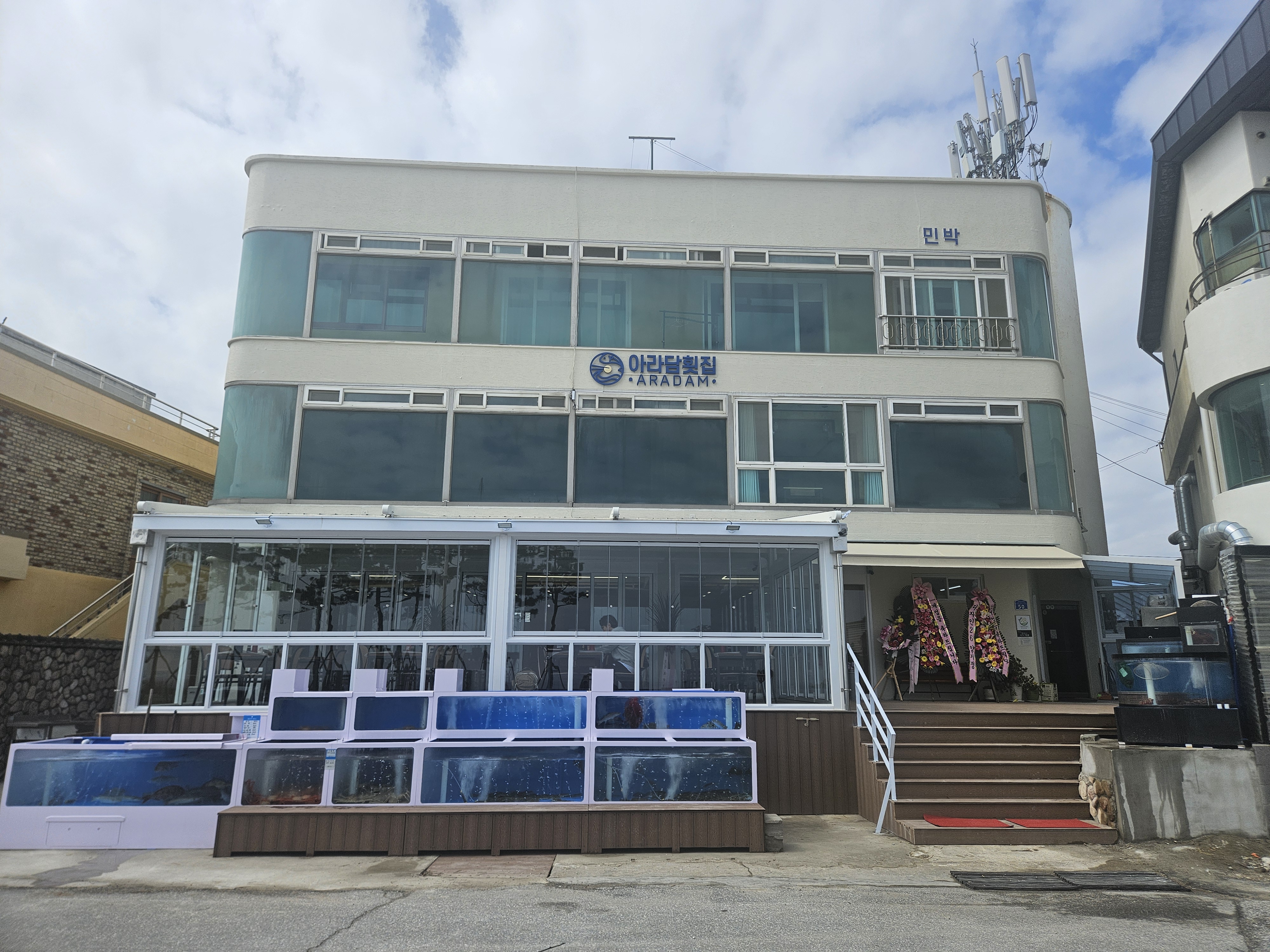 강릉 아라담횟집은 주문진 해변 근처에 위치해 있어 바다를 바라보며 식사할 수 있는 멋진 뷰를 자랑합니다. 가게 외관부터 깔끔하고 모던한 느낌이라 들어가기 전부터 기대감이 샘솟았어요. 수족관에는 싱싱한 해산물들이 가득해서 신선함은 두말할 필요 없겠죠?
