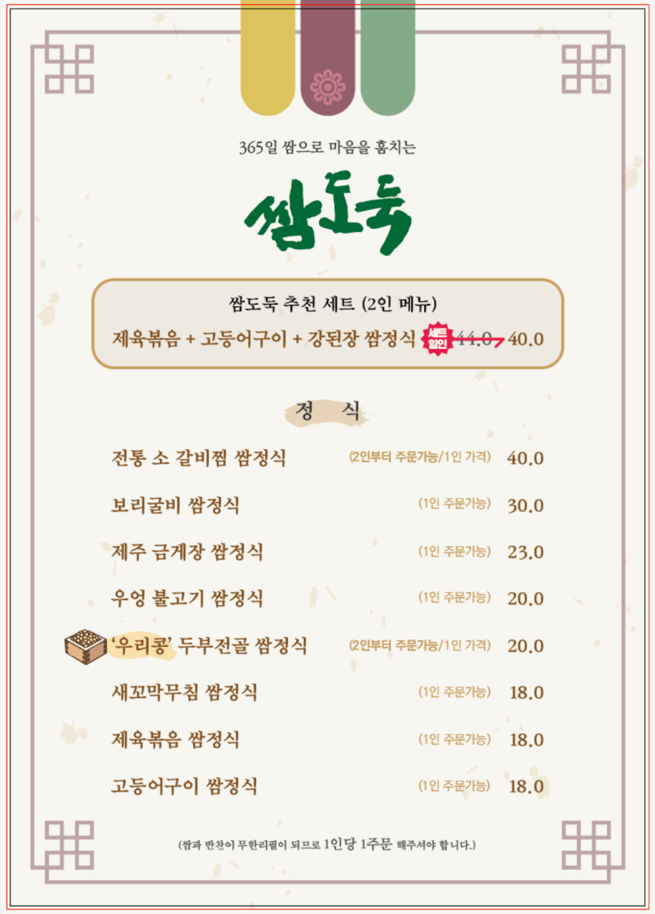 📌 쌈도둑 추천 세트 (2인 메뉴)