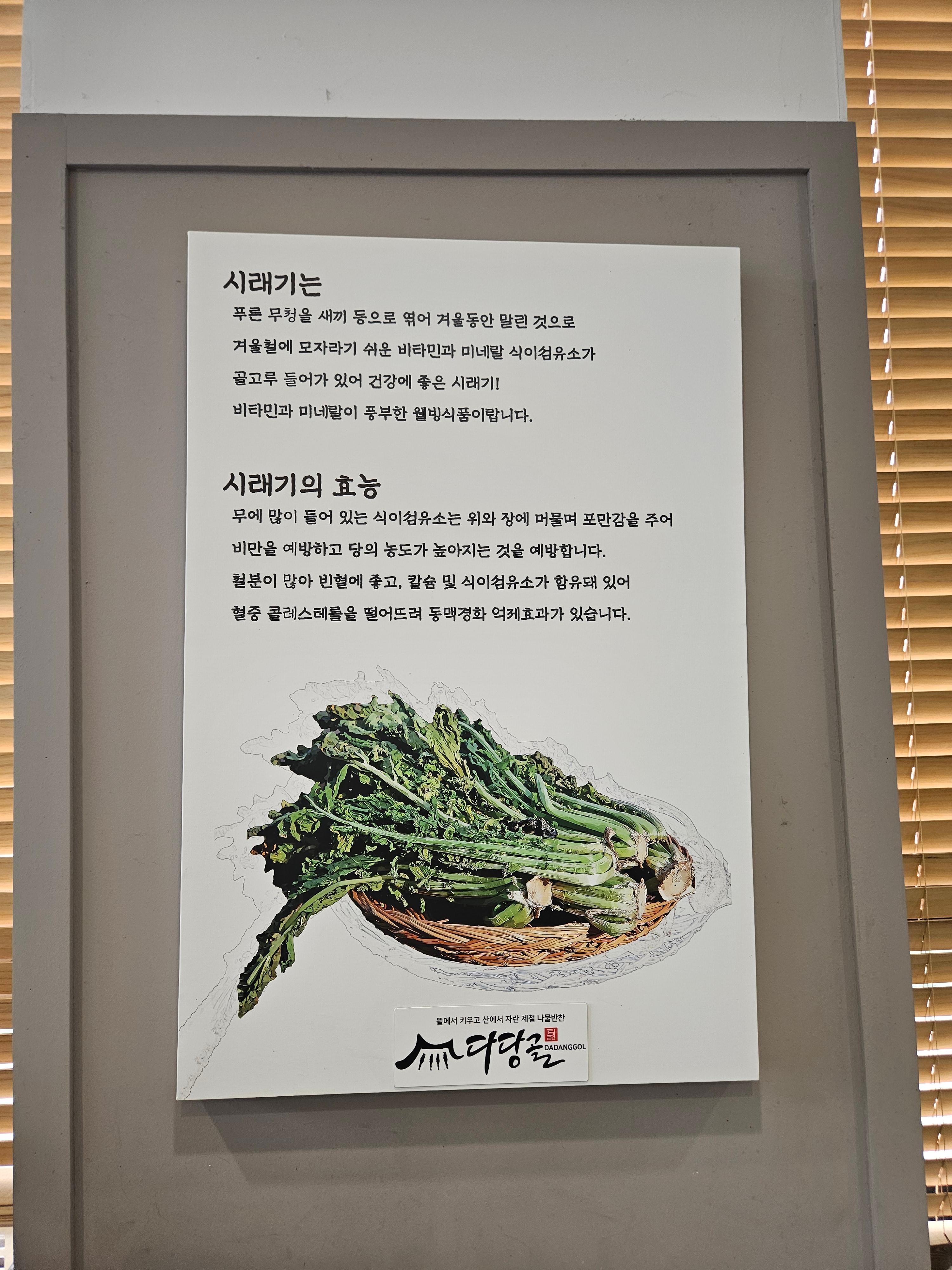 음식을 기다리는 동안 벽에 붙어있던 **'시래기의 효능'**에 대한 설명을 읽어보았는데, 푹 삶은 무청이 비타민과 미네랄은 물론 식이섬유가 풍부해 건강에 좋다는 내용이었습니다. 단순히 맛만 내는 것이 아니라, 좋은 식재료로 정성껏 음식을 만든다는 인상을 받았습니다.