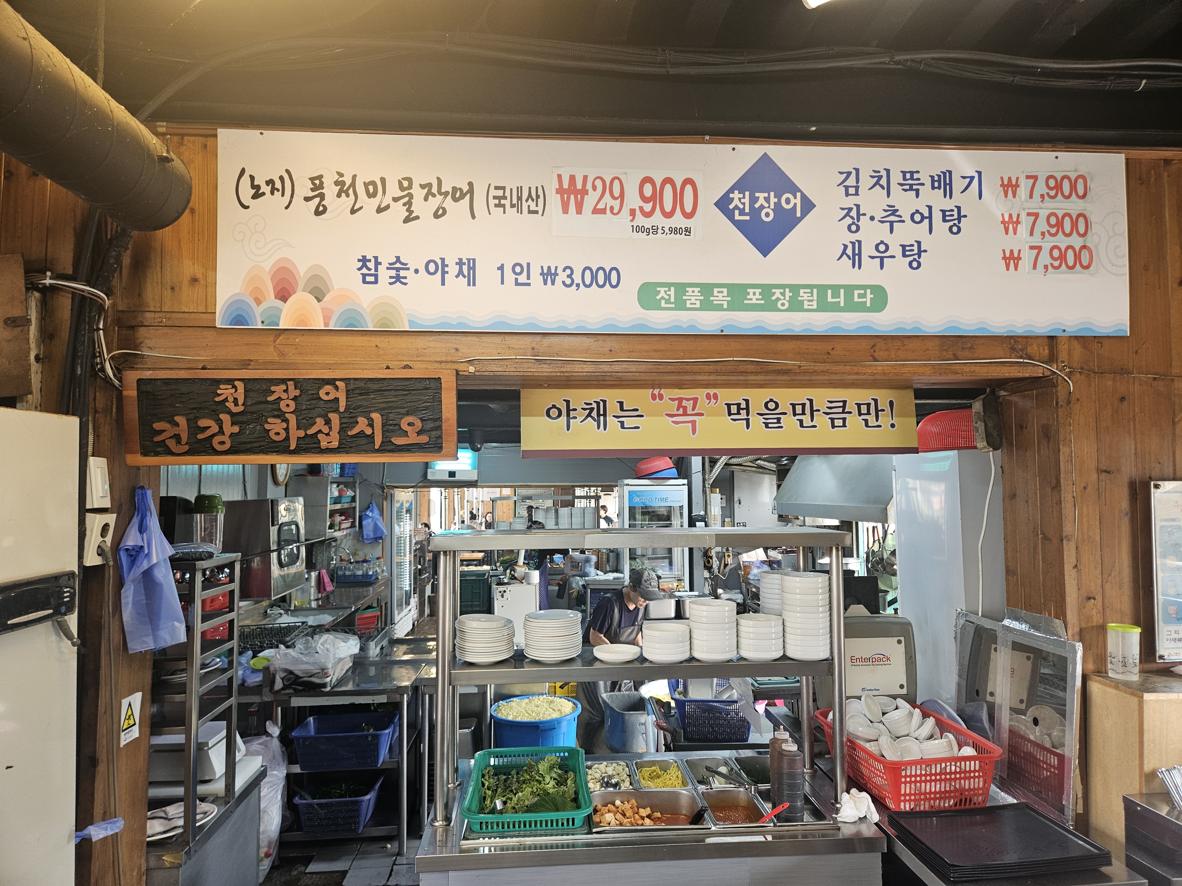 장어 외에도 장 추어탕, 새우 매운탕, 김치 뚝배기 등의 탕류 메뉴도 ₩7,900으로 저렴하게 즐길 수 있어 장어와 함께 곁들이기 좋아 보였어요. 전 품목 포장 판매도 된다니 참고하세요!(아쉽게도 탕은 2인분부터 포장된다고 하십니다)