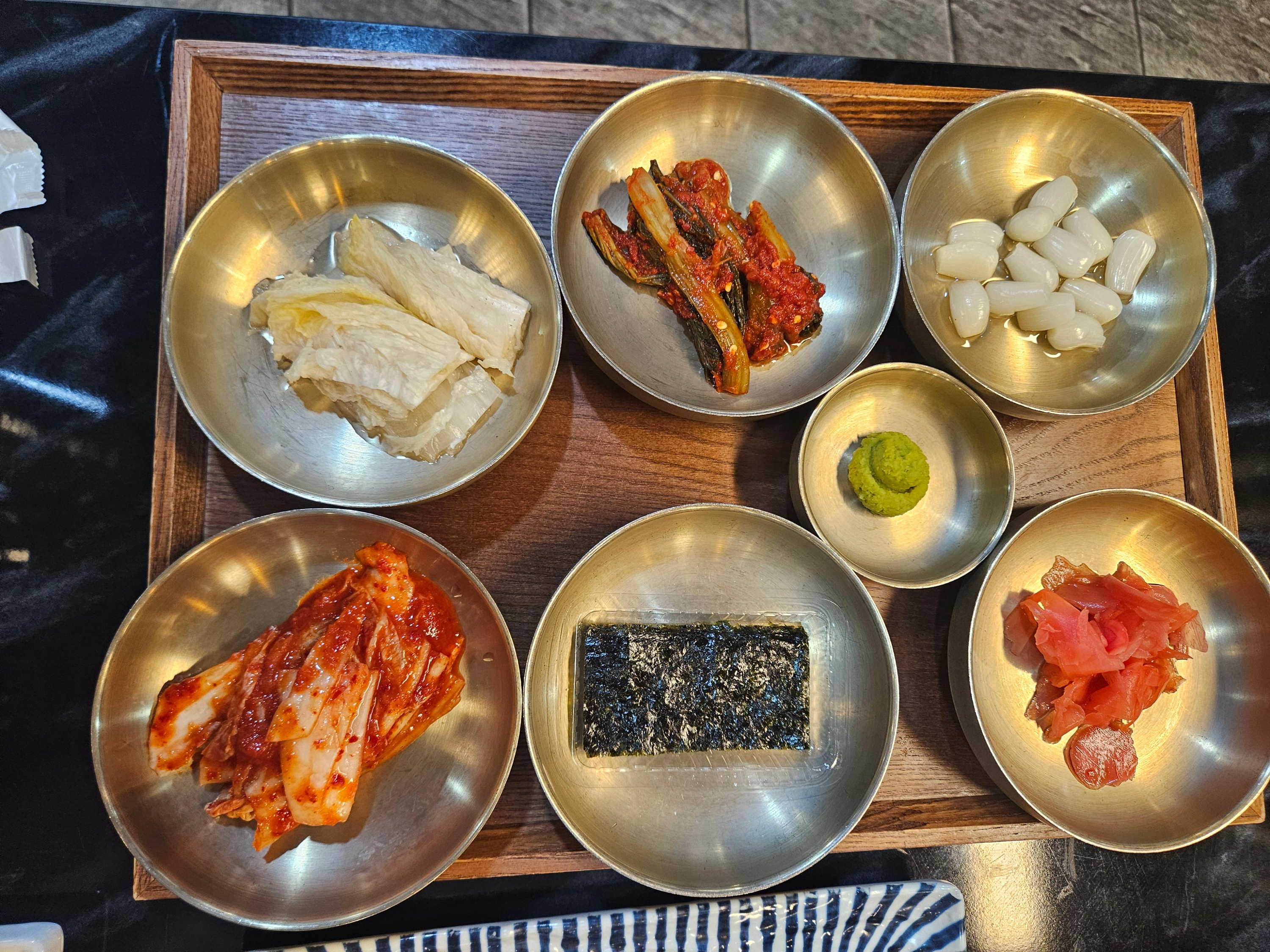 - 기본 반찬: 잘 익은 김치, 김, 양념 꼬시래기, 절인 양파, 초생강, 락교, 와사비 등 다양한 기본 찬이 정갈하게 차려집니다.