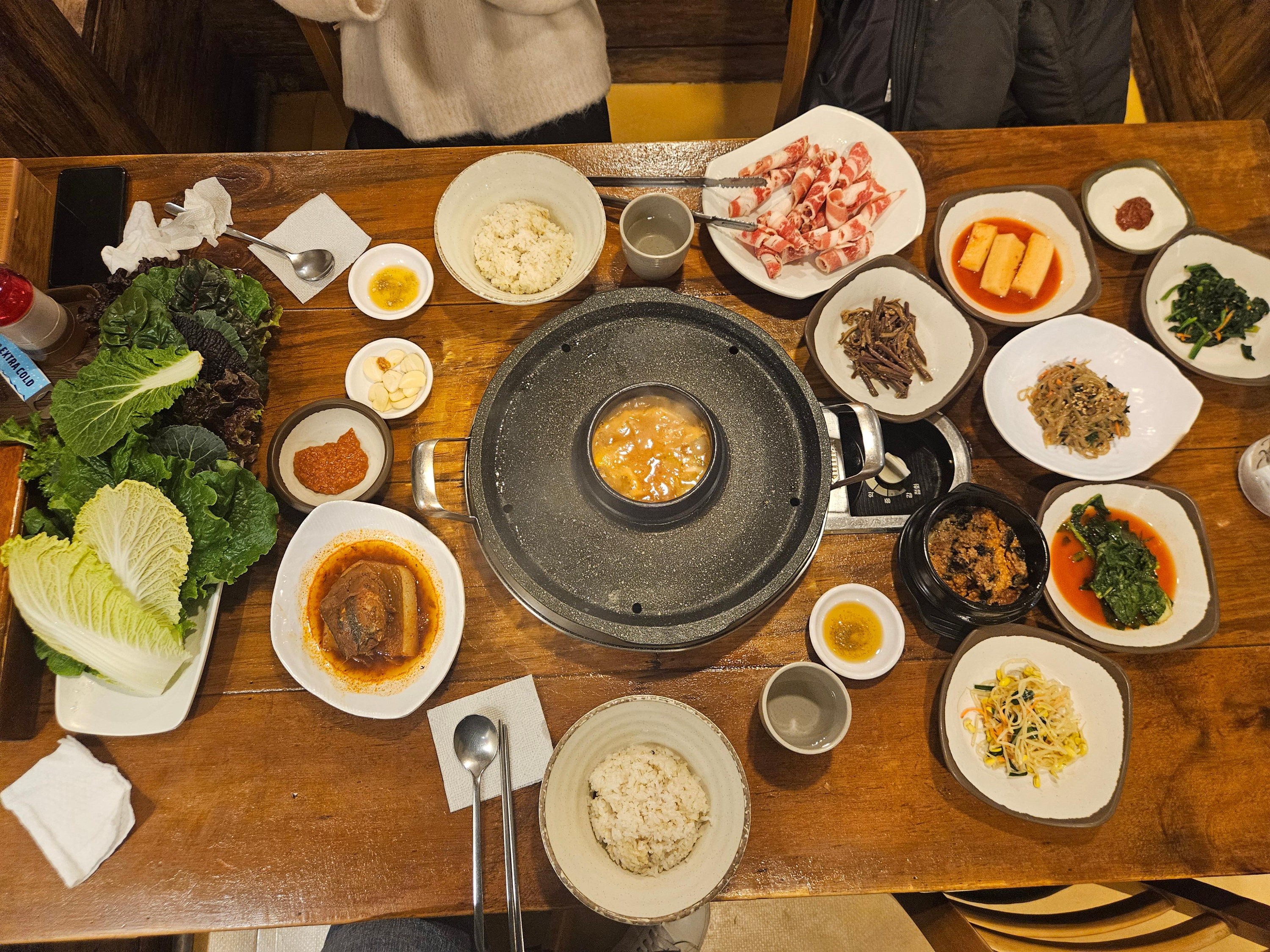 - 고기와 찌개: 테이블 중앙의 불판에서 고기를 바로 구워 따끈하게 즐길 수 있고, 불판 가운데에 된장찌개가 함께 올라와 식사 내내 뜨끈한 국물을 맛볼 수 있는 구조가 아주 만족스러웠습니다.