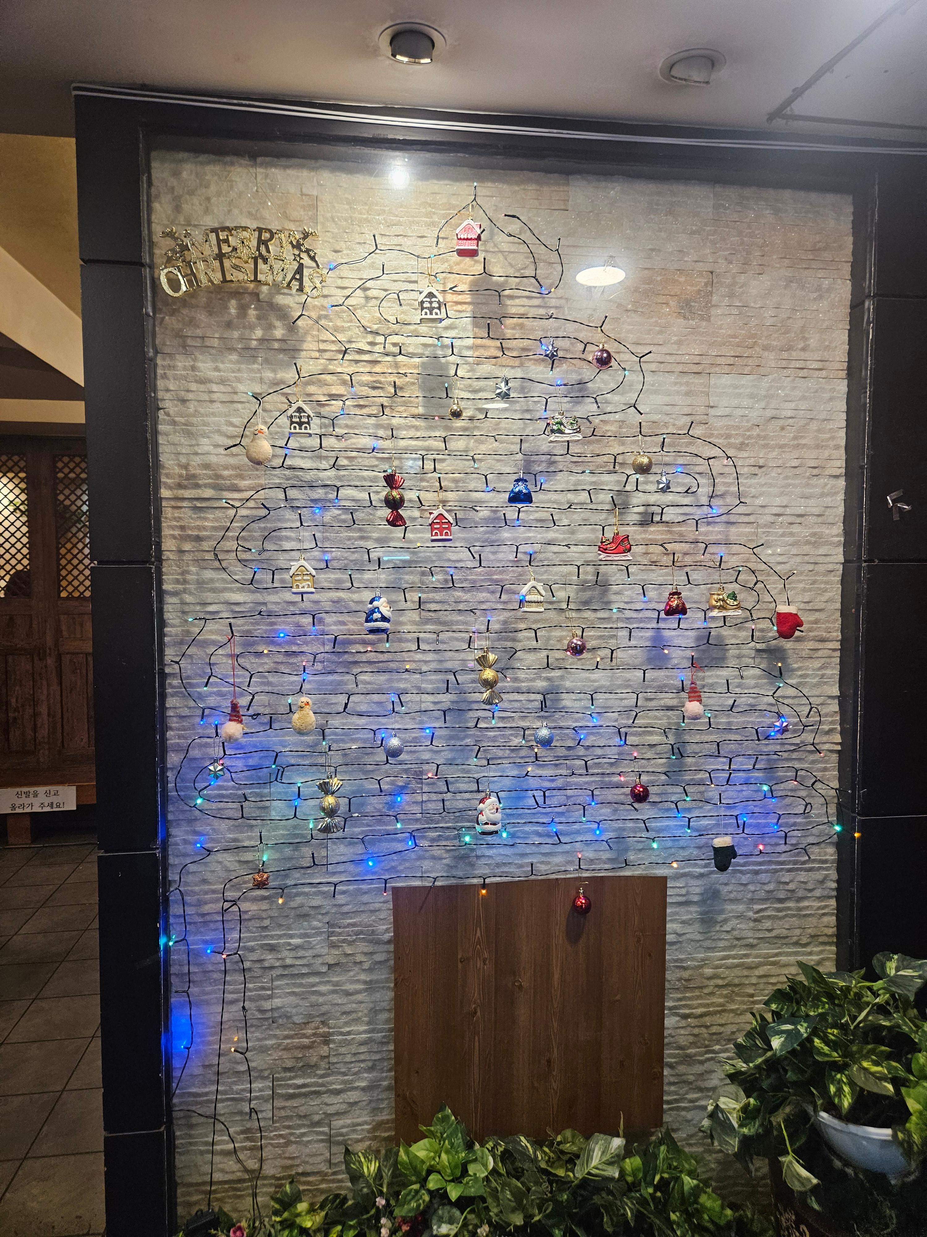 내부는 굉장히 넓고 쾌적합니다. 특히 나무 소재를 활용한 인테리어와 곳곳에 배치된 대형 해바라기 조화, 나무 장식 덕분에 따뜻하고 토속적인 분위기가 물씬 풍겨요. 프라이빗하게 식사할 수 있는 칸막이 좌석과 단체 모임을 위한 넓은 테이블이 잘 갖춰져 있어 회식 장소로도 손색없어 보였습니다. 연말 시즌이라 벽면에 예쁘게 꾸며진 크리스마스 트리 장식도 인상적이었네요!