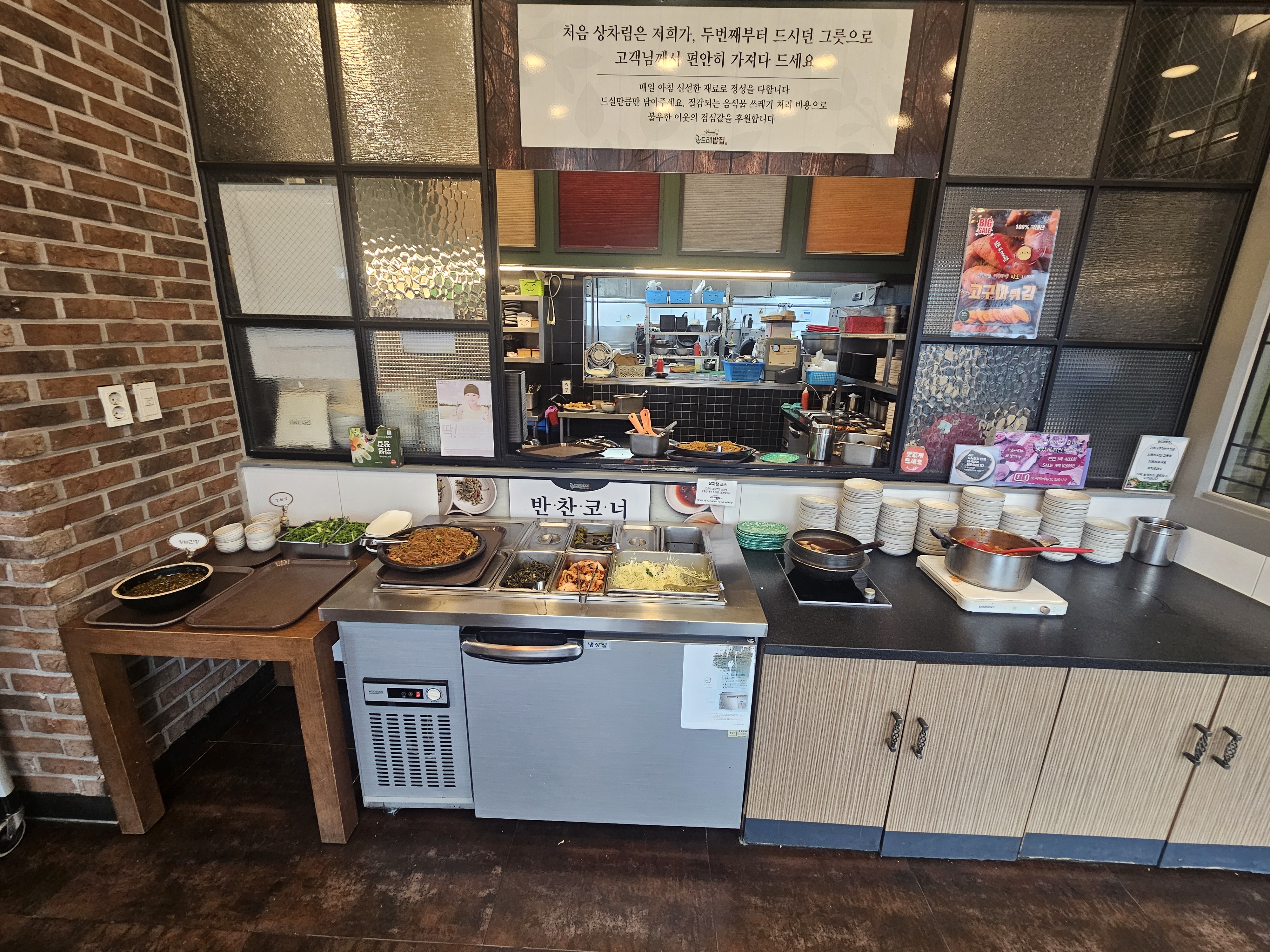 이 집의 특징 중 하나는 반찬 코너가 따로 마련되어 있다는 점이에요. 처음 상차림은 직원분들이 준비해 주시고, 이후에는 부족한 반찬을 직접 가져다 먹을 수 있는 방식입니다.