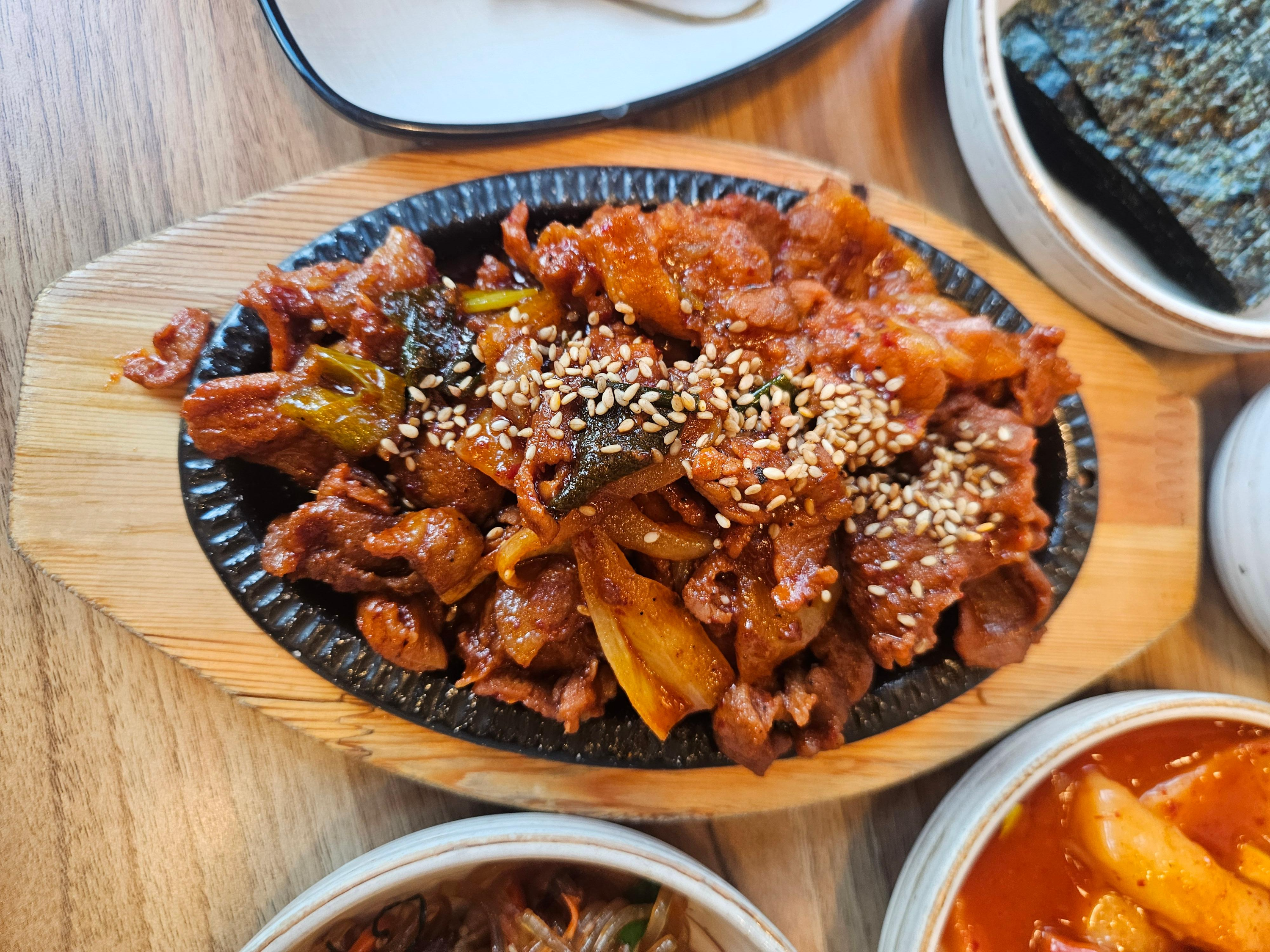 불판에 담겨 나오는 제육볶음은 비주얼부터 합격입니다. 윤기 도는 양념에 고기 양도 넉넉하고, 양파와 채소 비율도 좋아요.