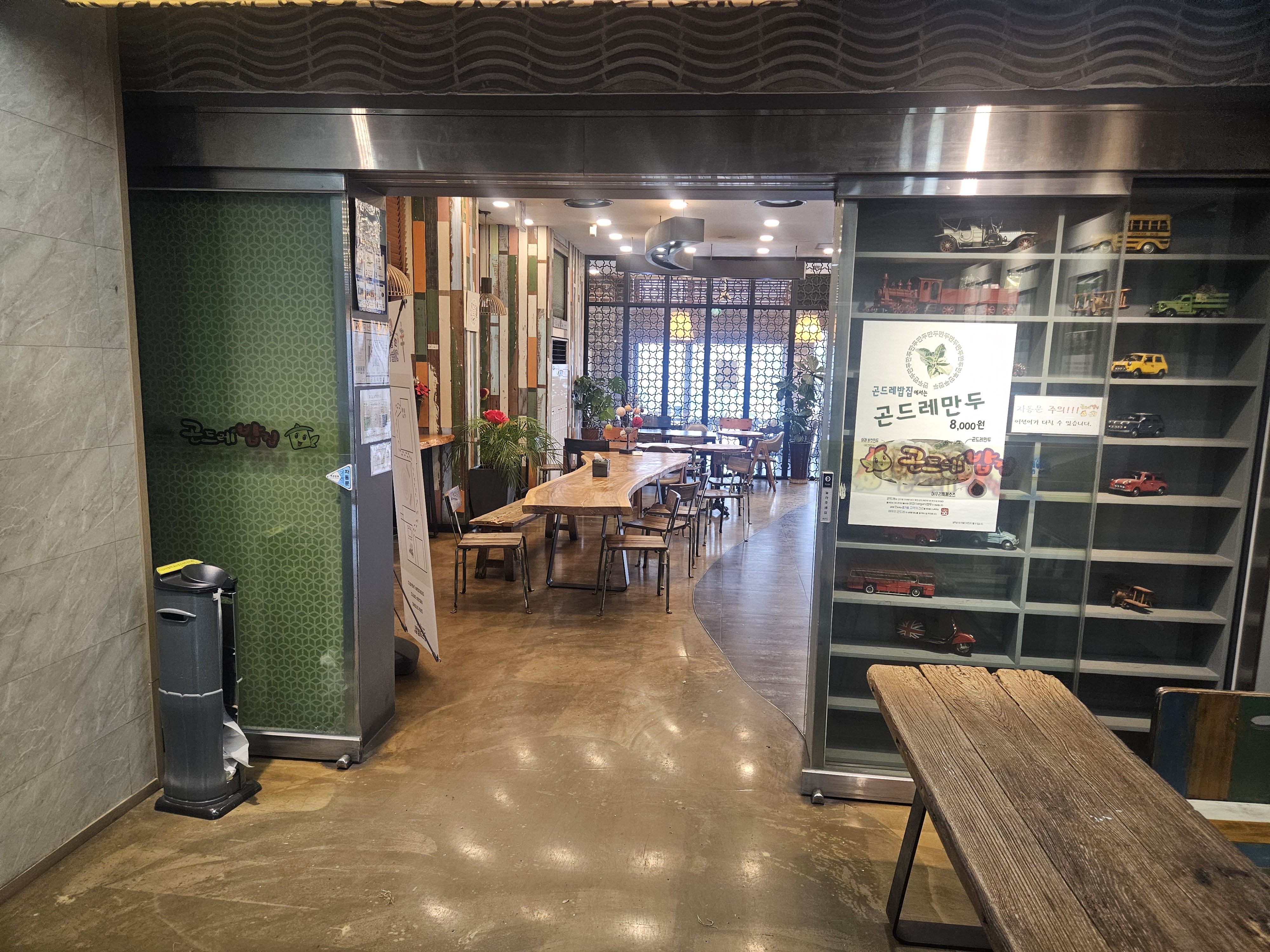 가게 외관은 멀리서도 한눈에 들어오는 네온 간판 덕분에 찾기 쉬운 편이에요. ‘곤드레밥집’이라는 상호가 주는 느낌처럼 화려하기보다는 편안하고 친근한 인상입니다.